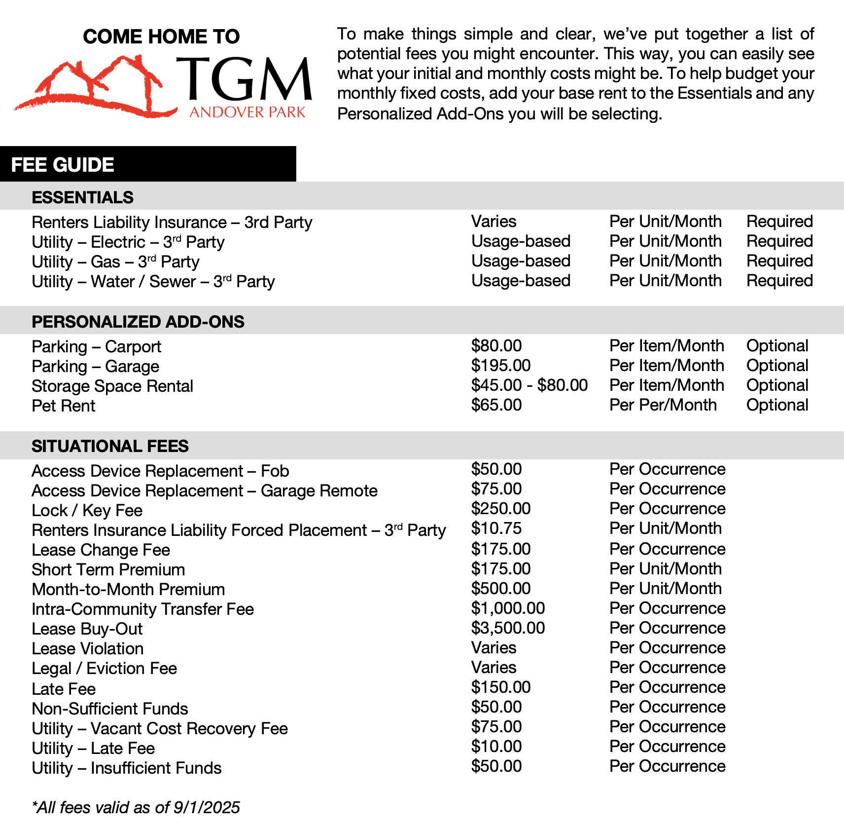 Please see our easy-to-use Fee Guide to calculate your initial and monthly costs in addition to base rent.